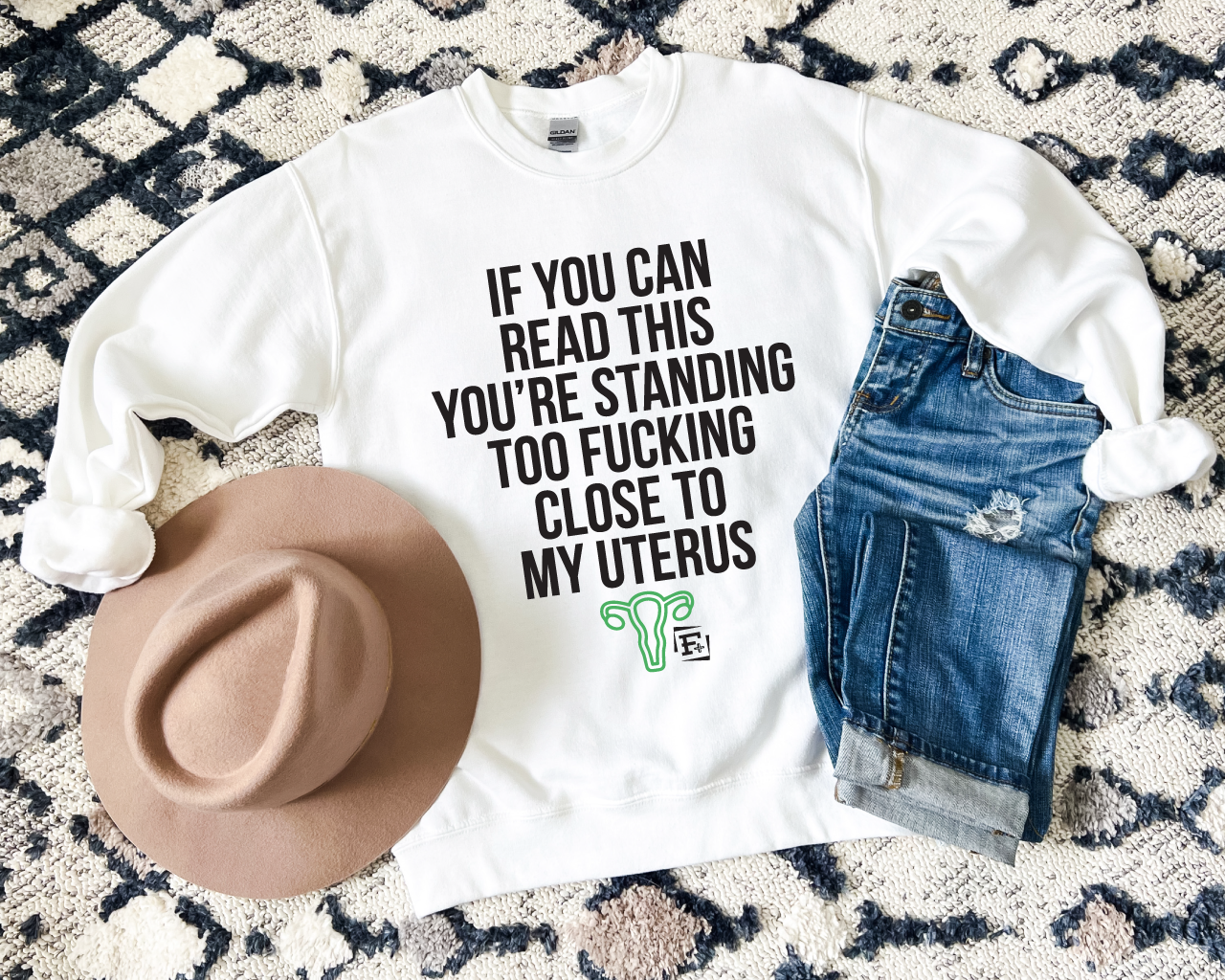 NEED some personal space???...GET some personal space with "My Feral Uterus!" This one is perfect for letting people know their proximity is not appreciated. No more unwanted touching or crowding - just sweet, sweet boundaries.